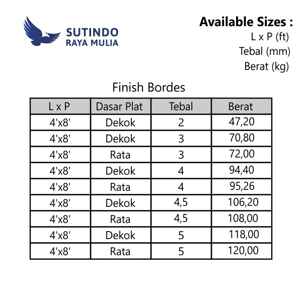Di bawah ini adalah tabel yang akan menunjukan ukuran dan dan juga berat per lembarnya. 08mm x 4ft x 8ft Pres. 5â x 20â Tebal mm x 729 Berat Kg WEIGHT Kg 6â x 20â Tebal mm x 875 Berat Kg WEIGHT Kg  TABEL BERAT DIATAS BISA DIGUNAKAN UNTUK.